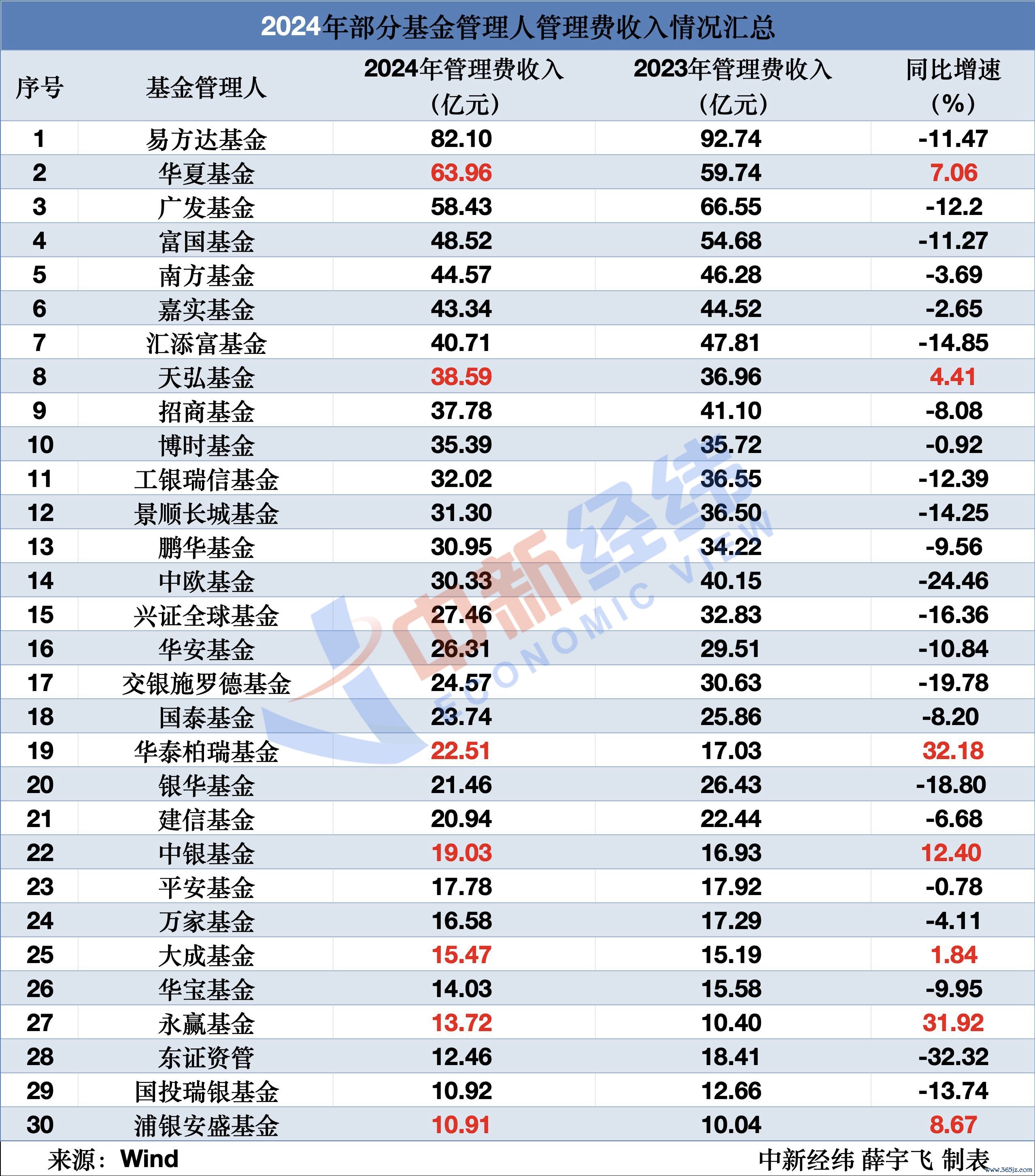 2024年管理费收入超过10亿元的30家基金管理人中,有7家管理费收入较2023年有所增长。